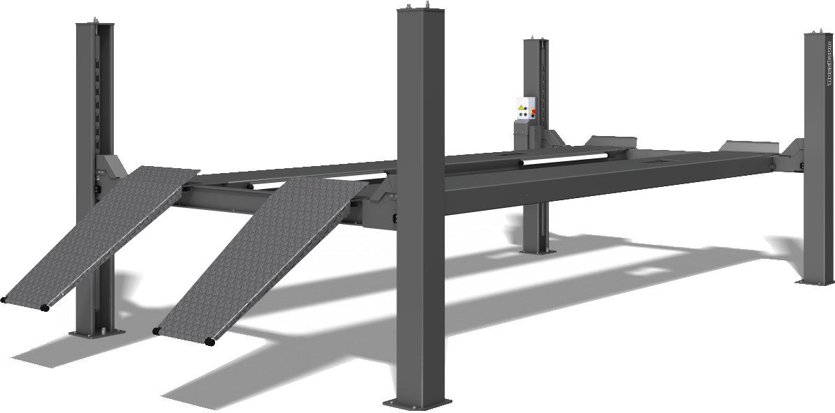 Hydraulic lift with 4 columns for cars and vans with adjustable platform. The hydraulic unit is ergonomically mounted externally on a column. Elevation / descent through push buttons. All controls are located close to the unit and are easily accessible to the user. The main switch can be locked to ensure safety. High precision rack for alignment, locking distance every 100mm, so we can align at any height. (it is not possible to align on the COMBI LIFT 4.40 S model) new paragraph